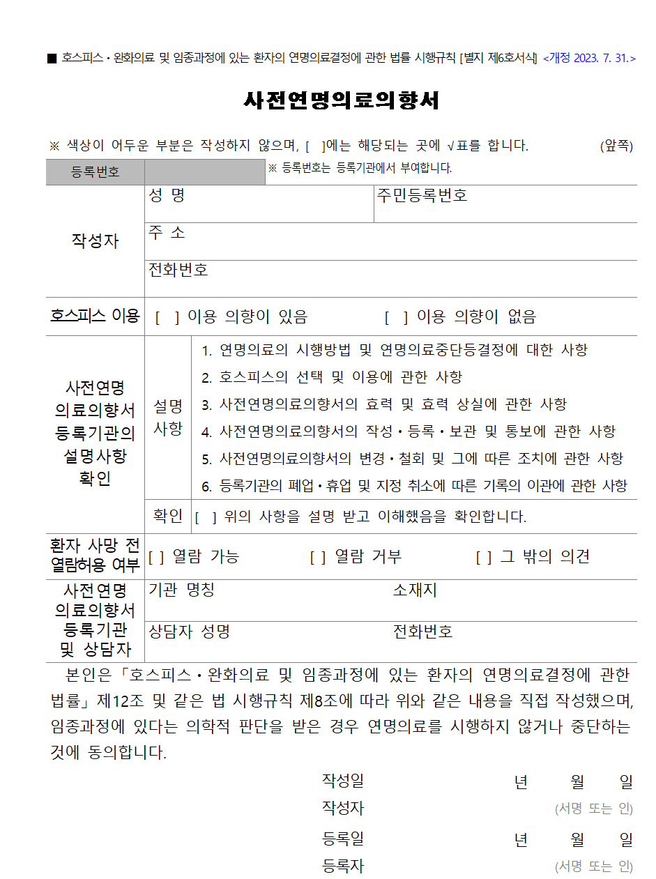 말기 환자 또는 임종기 환자가 담당 의사와 상담 후 직접 작성하는 문서입니다.